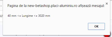 În cazul în care, lățimea sau lungimea tastată depășesc valoarea formatului standard de 1520*3020 mm, veți fi atenționați asupra acestui lucru și sistemul va corecta valoarea respectivă.Valoarea minimă nu poate fi mai mic de 40 mm.