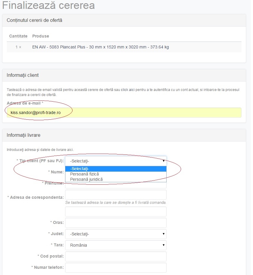 După ce se alege finalizarea cererii, o să apară lista cu articolele configurate și va trebui să completați datele de identificare, precum: adresă de e-mail, datele personale sau ale firmei.