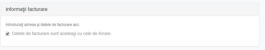 Dacă datele de facturare coincid cu datele de livrare, atunci bifați caseta ”Datele de facturare sunt aceleași cu cele de livrare” astfel sistemul va completa automat toate câmpurile. Dacă datele de facturare diferă de cele de livrare, atunci vă rugăm să completați câmpurile.