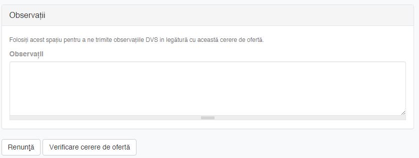 Secțiunea de Observații vă ajută în cazul în care se dorește comunicarea unor informații care nu au fost solicitate mai sus, sau dacă sunt cerințe speciale în legătură cu cererea de ofertă.