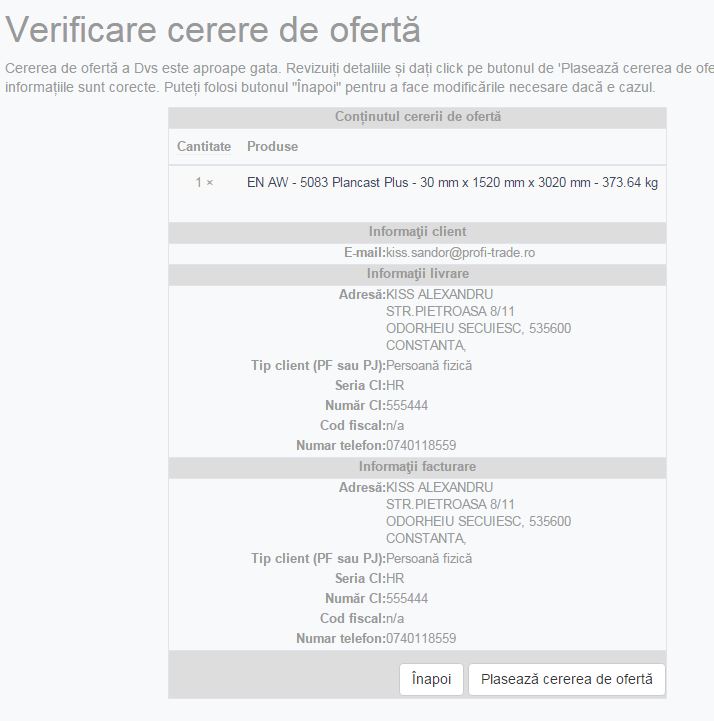 Astfel se ajunge la o pagină finală de verificare. Dacă totul este corect se poate apăsa butonul de ”Plasează cererea de ofertă”