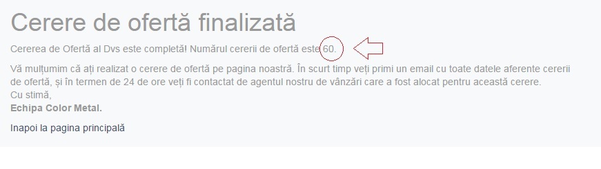 După plasarea cererii de ofertă, se ajunge la un ecran, unde se comunică că procedura este finalizată și că această cerere se va aloca unui agent de vânzări care vă va contacta în cel mult 24 de ore.